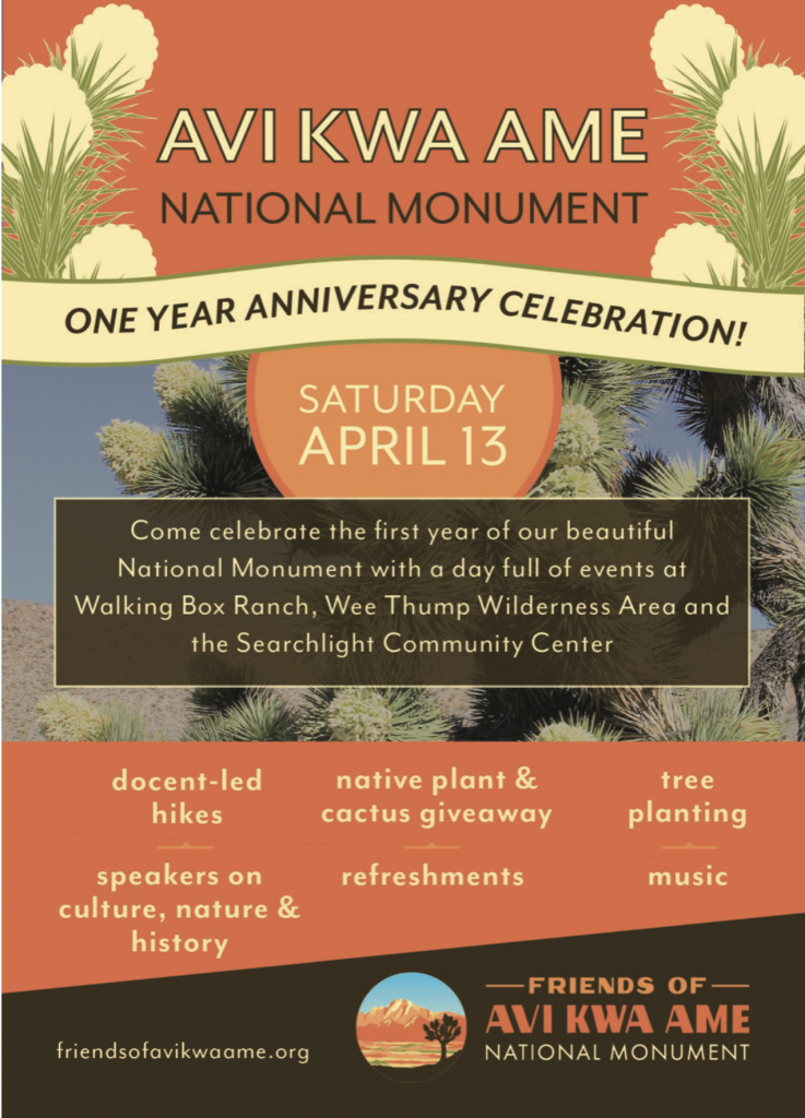 Upcoming Events Avi Kwa Ame National Monument One Year Anniversary Celebration Saturday, April 13th @ 8:30am – 4pm Walking Box Ranch & Searchlight Community Center Register to help […]